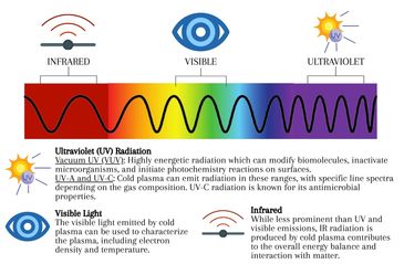 Cold plasmas are defined by a disparity in the temperatures of their species: electrons in cold plasmas are highly energetic, while the ions and neutral particles remain at or near room temperature. This unique energy distribution results in light emissions that are typically more targeted and less intense compared to those of hot and warm plasmas. Although the light produced by cold plasmas is often fainter, the precision and specificity of these emissions make them highly valuable for particular applications.