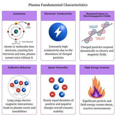 Plasma's unique characteristics distinguish it from other states of matter, providing insights into its behavior and interactions at a microscopic level. Fundamental characteristics such as ionization, electrical conductivity, and responsiveness to electromagnetic fields underlie its practical applications across various industries. Additionally, derived characteristics like stability, density, and reactivity are crucial in technologies ranging from fusion energy to materials processing, driving innovation and advancing scientific discovery.