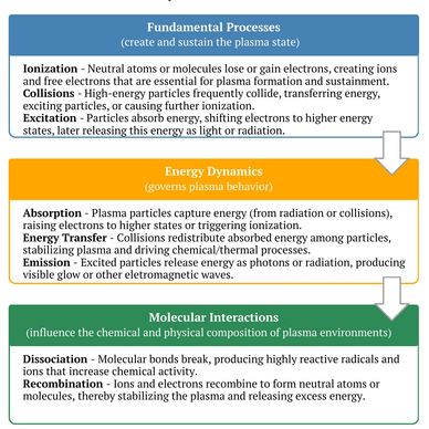 Plasma dynamics encompasses several processes that govern the behaviors, properties, and interactions of plasma. Some of these interconnected processes include fundamental processes (ionization, collisions, and excitation), energy dynamics (absorption, energy transfer, and emission), and molecular interactions (dissociation and recombination). Understanding how these processes interrelate and contribute to the plasma's complex nature enhances theoretical knowledge and informs practical applications in materials science, fusion technology, medicine, agriculture, and other fields.