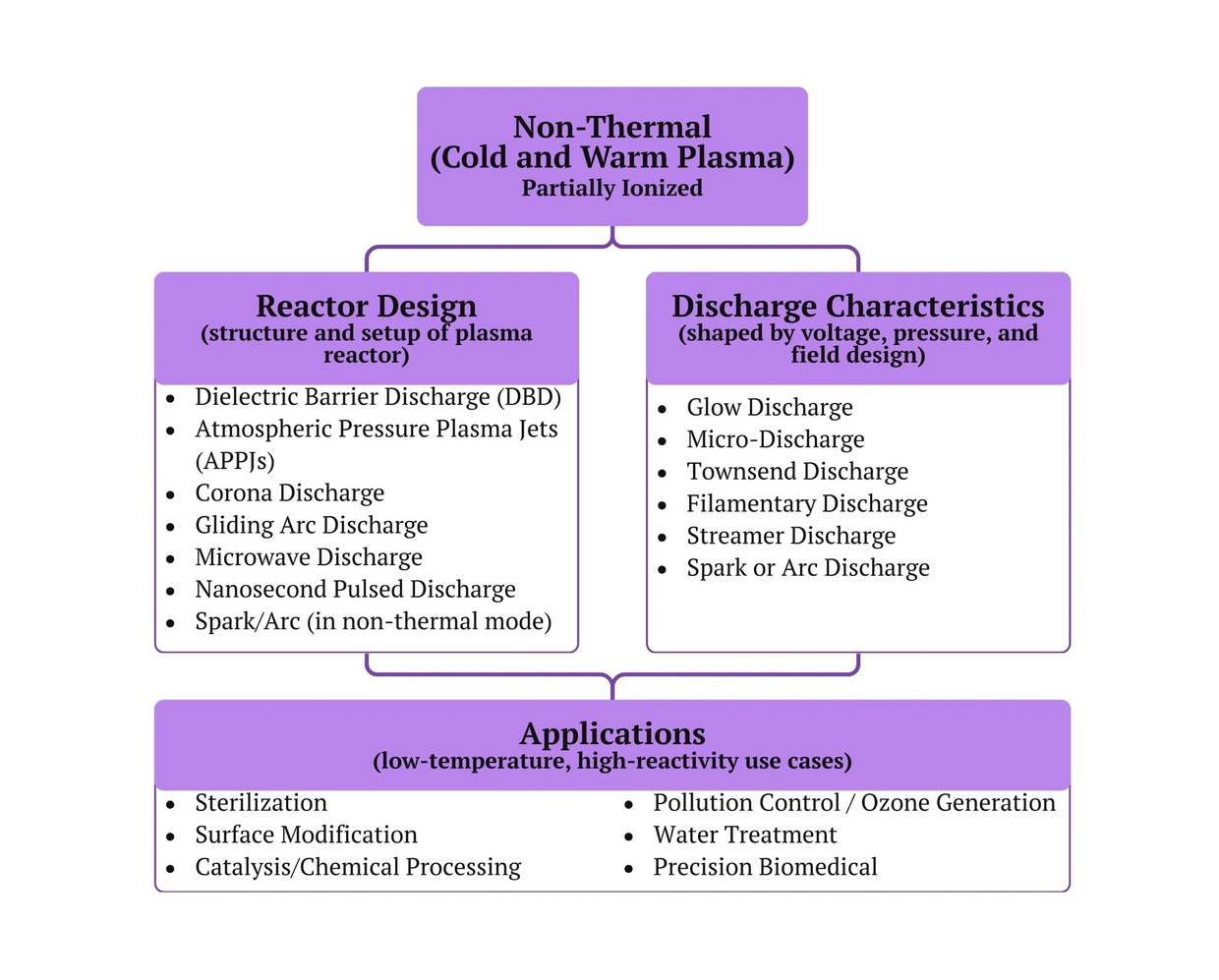 While thermal plasma remains important for certain applications, recent innovations and advances in non-thermal plasmas have garnered significant attention across multiple fields. These systems have become increasingly popular due to their versatility and effectiveness in various applications. The classification of non-thermal discharges often depends on reactor design (e.g., dielectric barrier discharge, atmospheric pressure plasma jets, corona, gliding arc, microwave, and nanosecond pulsed discharge) and discharge characteristics (e.g., glow, micro, townend, filamentray, streamer, spark, and arc discharge), as they influence the operational stability, efficiency, and suitability for specific applications. Other factors, such as energy input (e.g., direct current, alternating current, pulsed) and gas composition (e.g., noble gas, air, reactive gas), are also fundamental for understanding plasma performance.